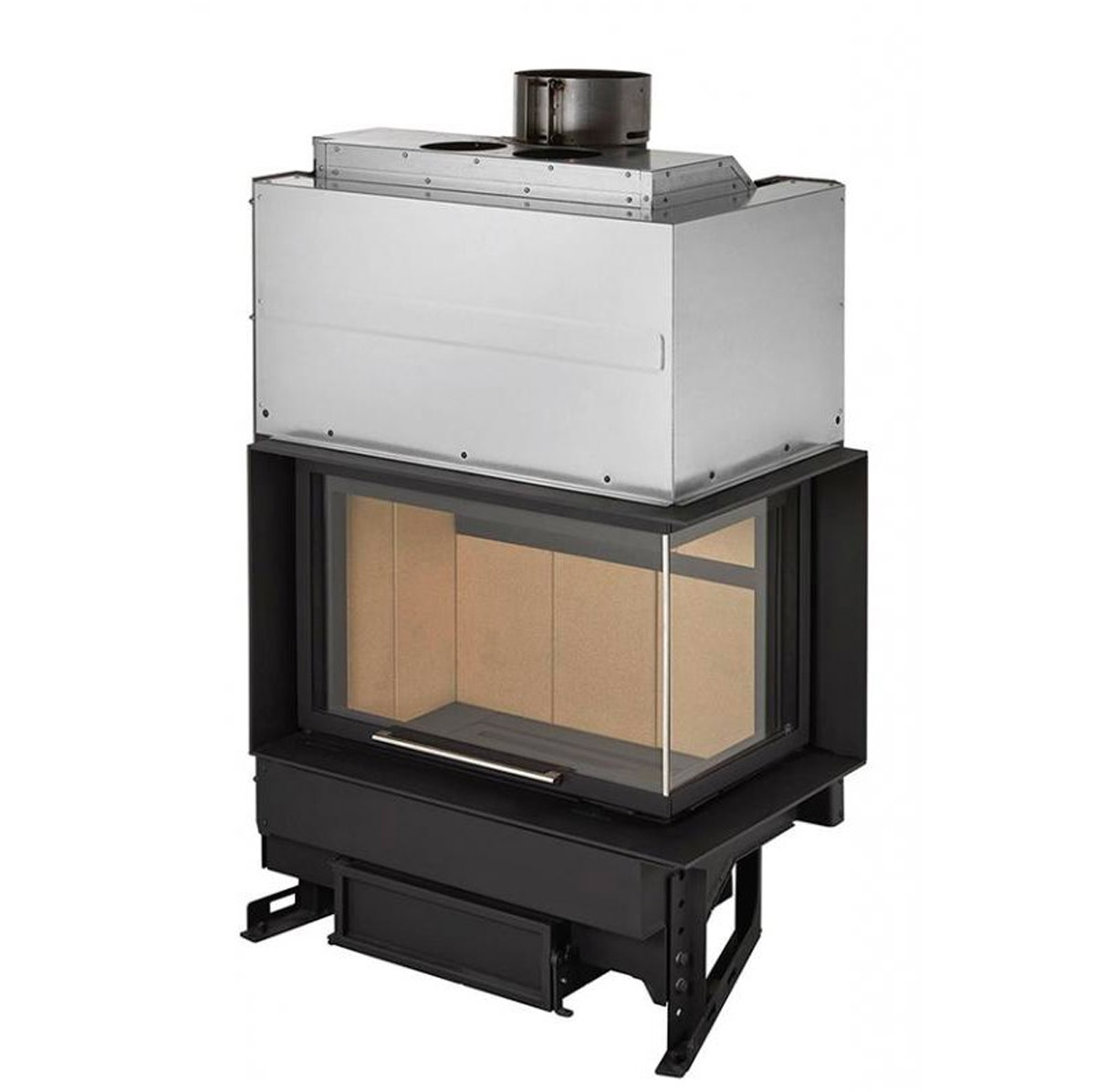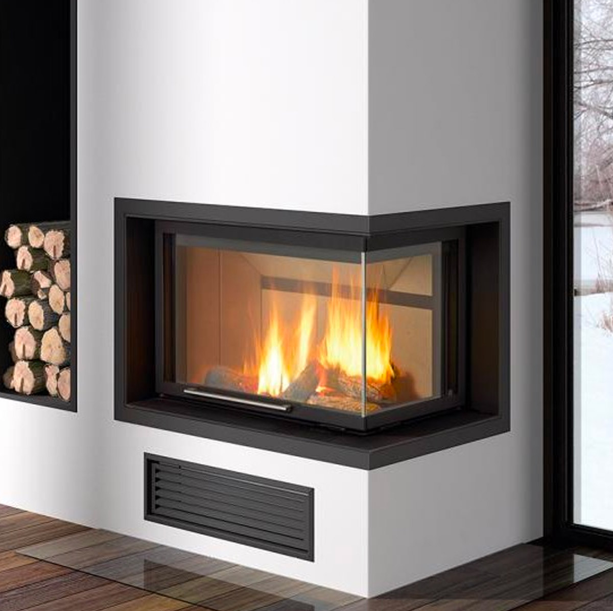 L’insert à bois Rocal ARc 70 A : déclinaison avec vitre latérale en angle, permettant une vision du feu sur deux côtés et donnant plus de profondeur et de dynamisme au foyer.