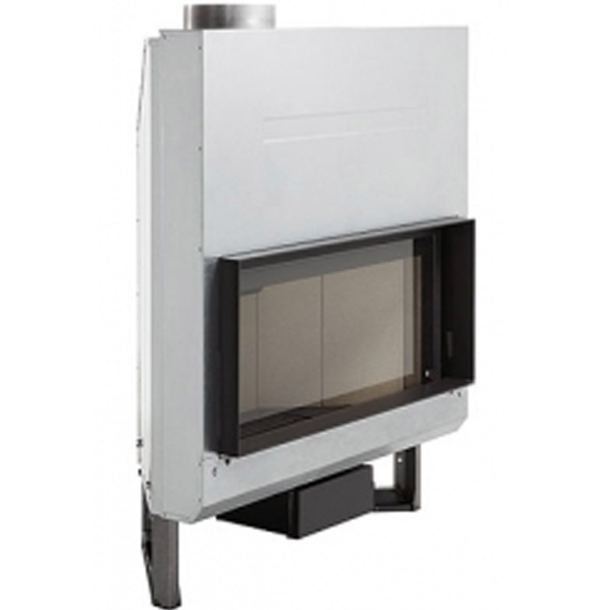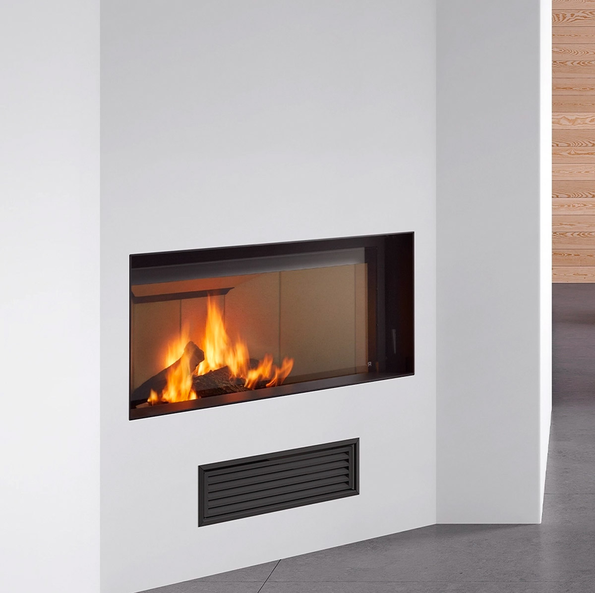 L’insert à bois Rocal ARc 70 A : déclinaison avec vitre latérale en angle, permettant une vision du feu sur deux côtés et donnant plus de profondeur et de dynamisme au foyer.