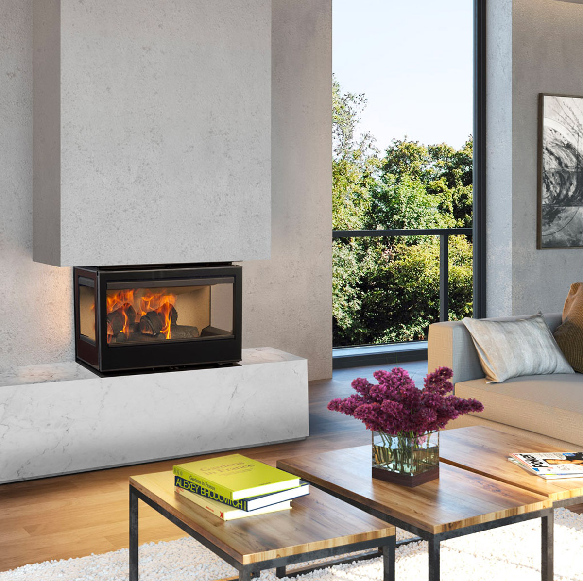 Vision immersive du feu : grâce à ses trois vitrages, ce modèle donne l’impression d’un feu « flottant » visible depuis plusieurs angles d’un séjour ouvert — idéal pour les intérieurs spacieux ou les traversées de pièce.