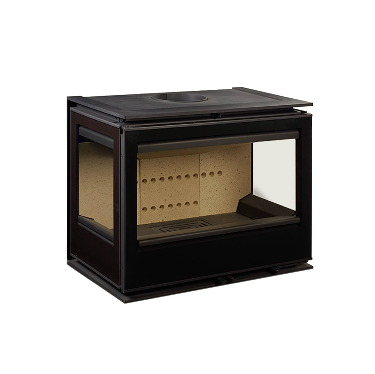 Vision latérale : la vitre sur le côté droit crée une ambiance plus immersive, permettant au foyer d’être apprécié non seulement depuis le frontal, mais aussi depuis un angle ou un espace adjacent.