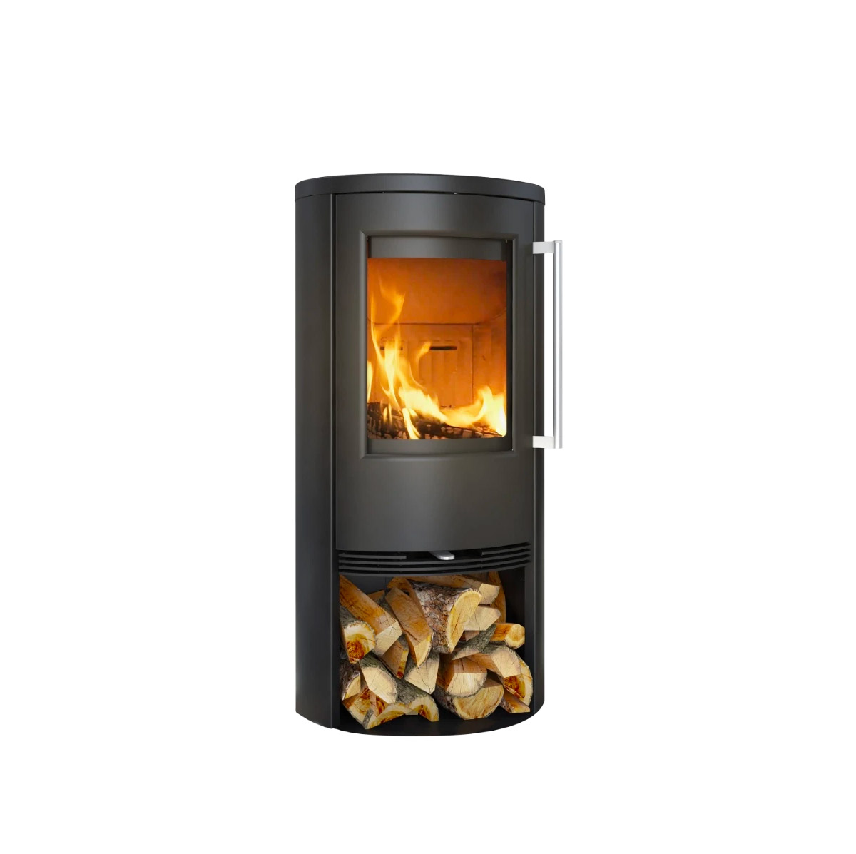 Le poêle à bois Termatech TT20R : équipé de parois latérales arrondies pour un design contemporain, poids env. 114 kg, rendement 82 %, puissance nominale 5 kW, consommation env. 1,6 kg/h.